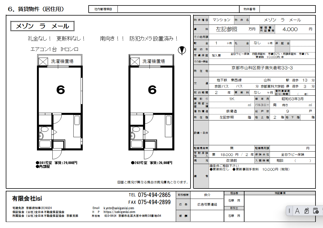 | メゾン ラ メール202 | 1K | 26,000円 | 4,000円 | 1ケ月 | なし | 2年 | 0円 | 相談 | 水道代共益費に含む |