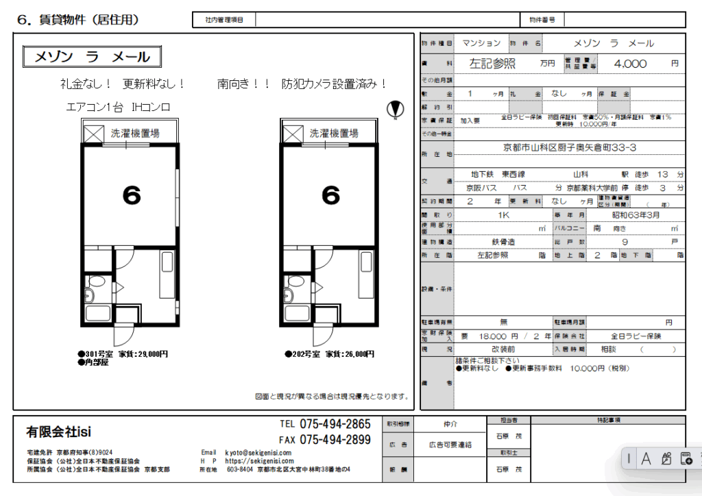 | メゾン ラ メール301 | 1K | 29,000円 | 4,000円 | 1ケ月 | なし | 2年 | 0円 | 相談 | 水道代共益費に含む |